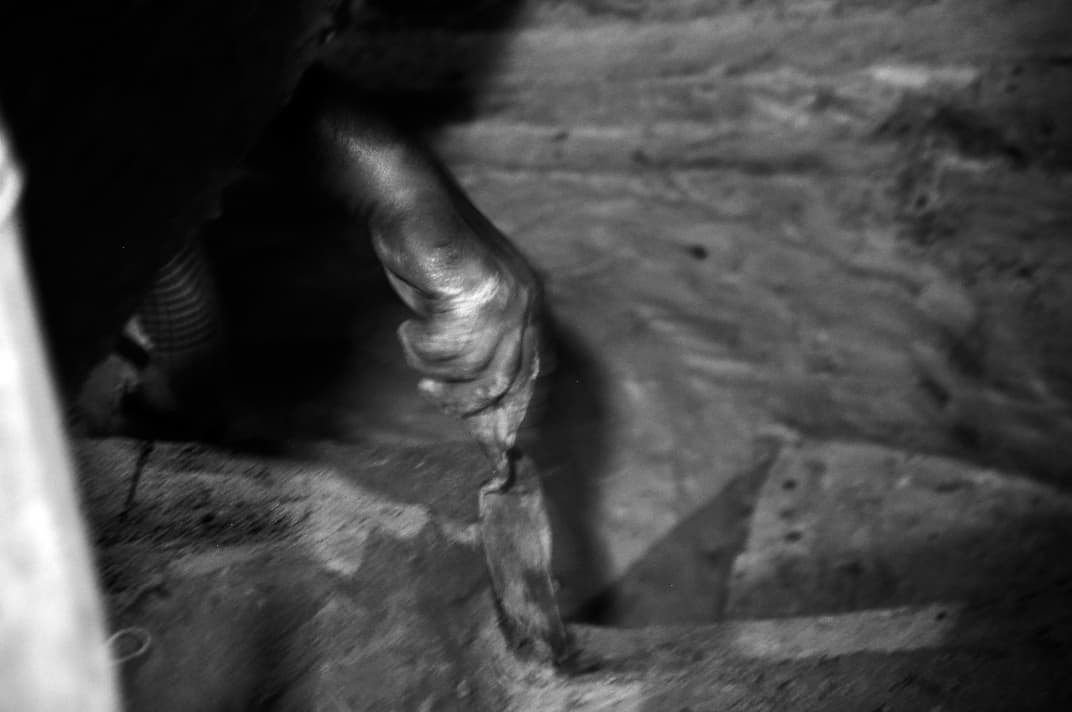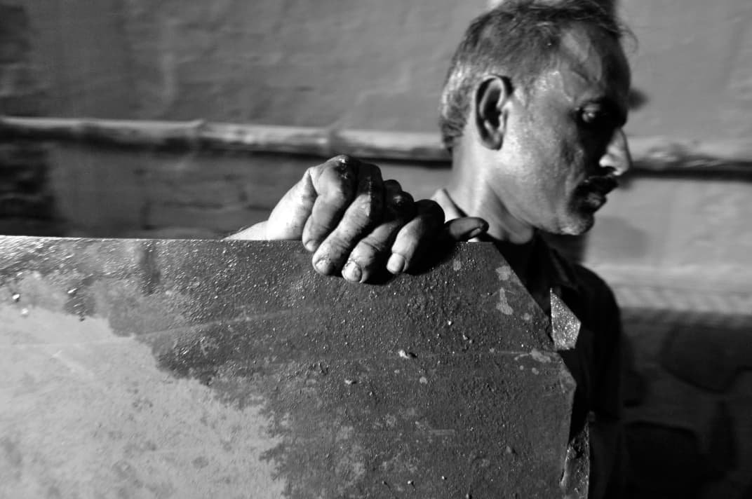 ছাপচিত্রী একটুকরো কাঠের গায়ে আঁচড় দিয়ে খোদাই করেন তাঁর রূপকল্পনা।
