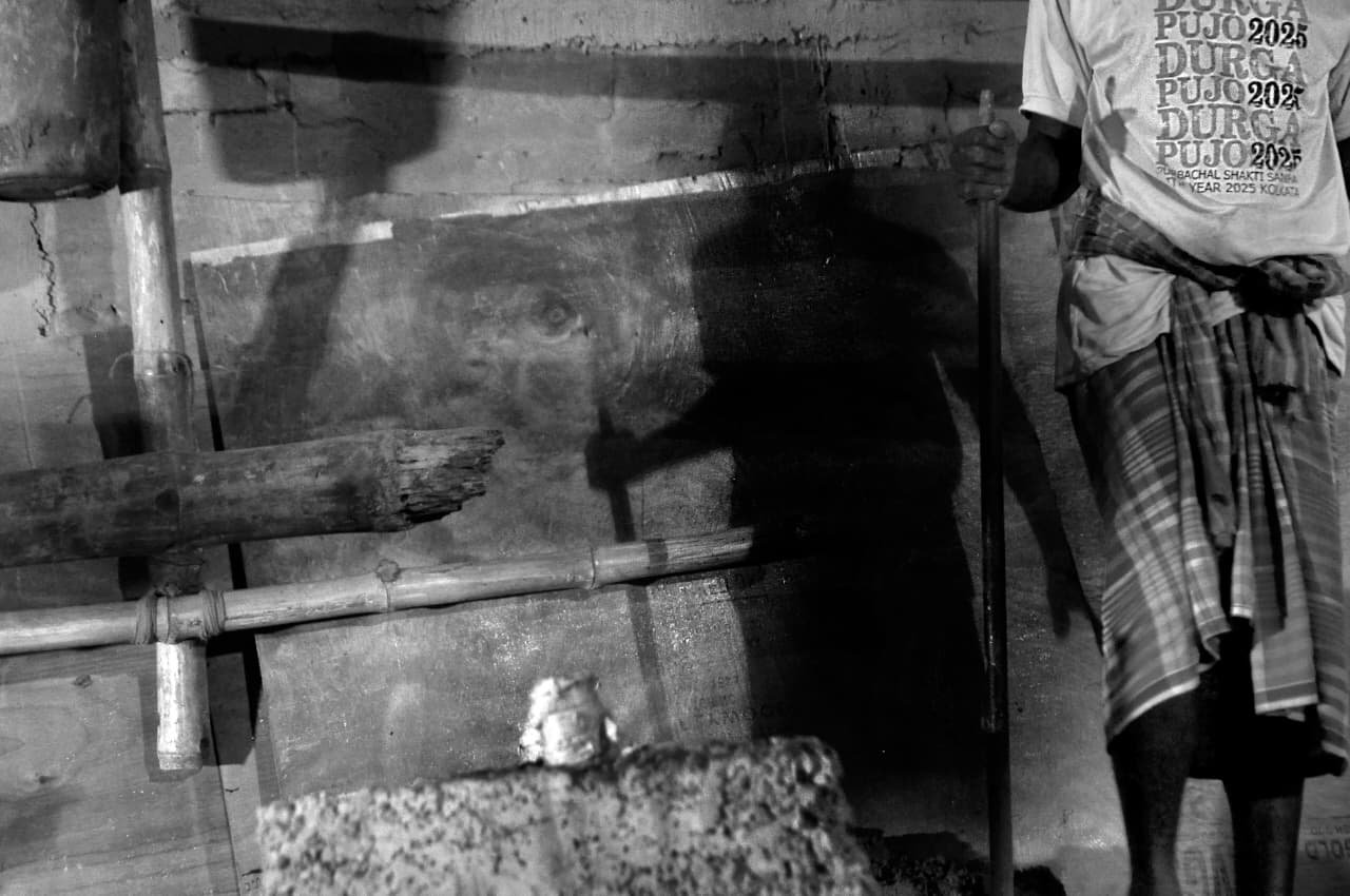 পূর্বাচলের পুজোমাঠকে খোদাই করে কিংবা মগ্ন শিল্পীর স্টুডিও তে কাঠ খোদাই করে, সাদা কালো রঙের দ্বন্দ্বে তৈরী হচ্ছে এই অন্ধকার থেকে আলোয় উত্তরণের কথকথা।